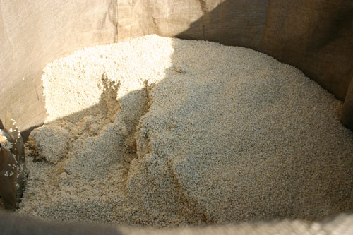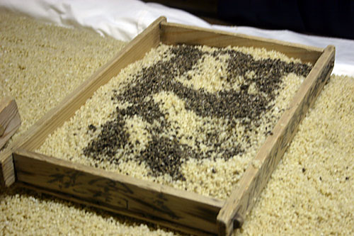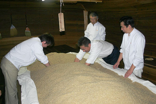 近年、自然発酵のモロミを使う酒造会社は少なくなりましたが、当社では麹室の壁と天井裏に籾殻(モミガラ)を寝かせ、自然発酵させ。なおかつ最適な状態を保つために、24時間体制で温度と湿度の管理を行っています。