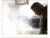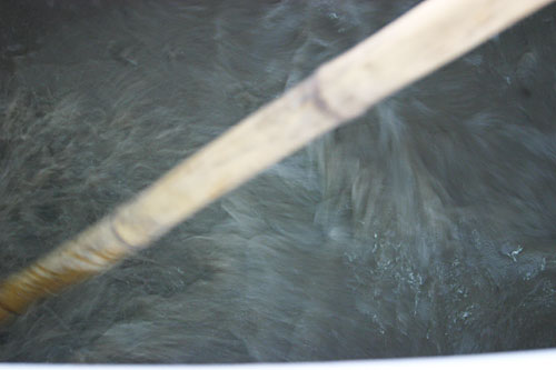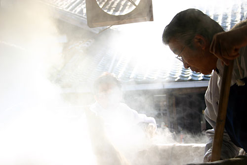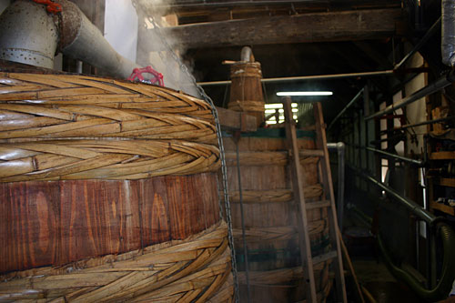 原料の麦は大分県産の裸麦を使用しています。裸麦は大麦よりも甘みが強く、個性的です。 麦を木樽に入れて洗うなど、一つ一つの作業、全てを手造りで行います。 裸麦のデンプンが麹によって糖に分解されます。当社の黒麹焼酎では黒麹を使い、より深い甘みと香りの強い諸味(もろみ)に変わります。