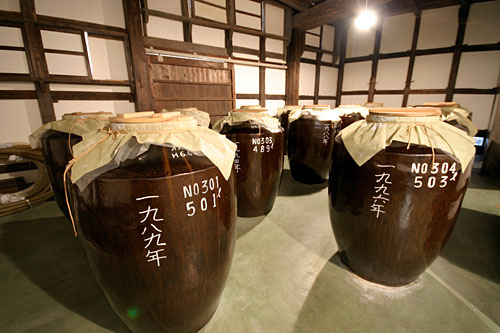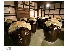 黒麹の焼酎は半年寝かせた後、一部は当社の蔵にある大甕で貯蔵されます。 甕で寝かすことによってよりまろやかになり、年代とともに深い味になっていきます。 当社の甕では、年代ごとの甕にその年だけの焼酎を寝かせ、新しい焼酎を足したりしない、純粋な焼酎を造っています。 黒麹焼酎は1986年から造り始め、20年ものの焼酎もできました。 黒麹を使ってできた焼酎は甘く、くせのある通好みの味です。